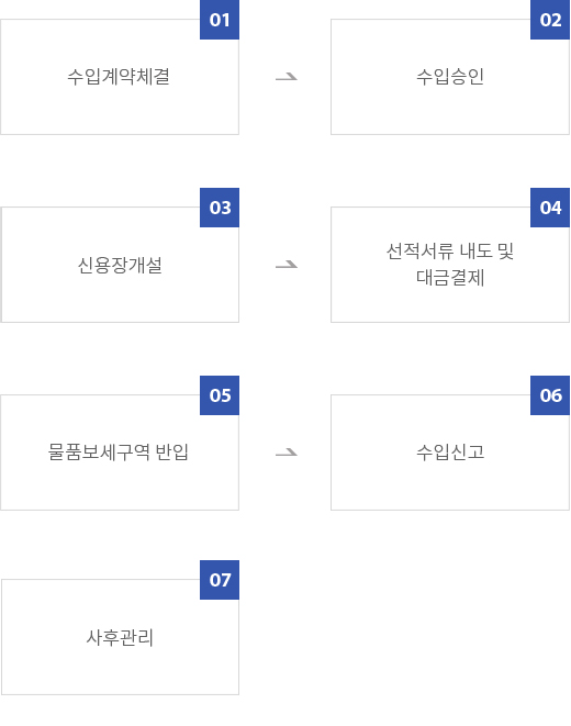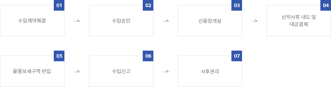 구비서류 수입 승인 신청서, 수입계약서, 수입대행 계약서, 기타 수출입 공고 규정을 충족하는 서류 신용장 개설 신청 수입신용장 개설신청서, 외국환거래 약정서, 수입승인서, 물품매도 확약서, 담보제공 증서 등 수입신고 신청 수입신고서, 수입승인서, 가격신고서(송장포함),선하증권 사본, 기타 필요서류(C/O, 수입물품 명세확인서 등)